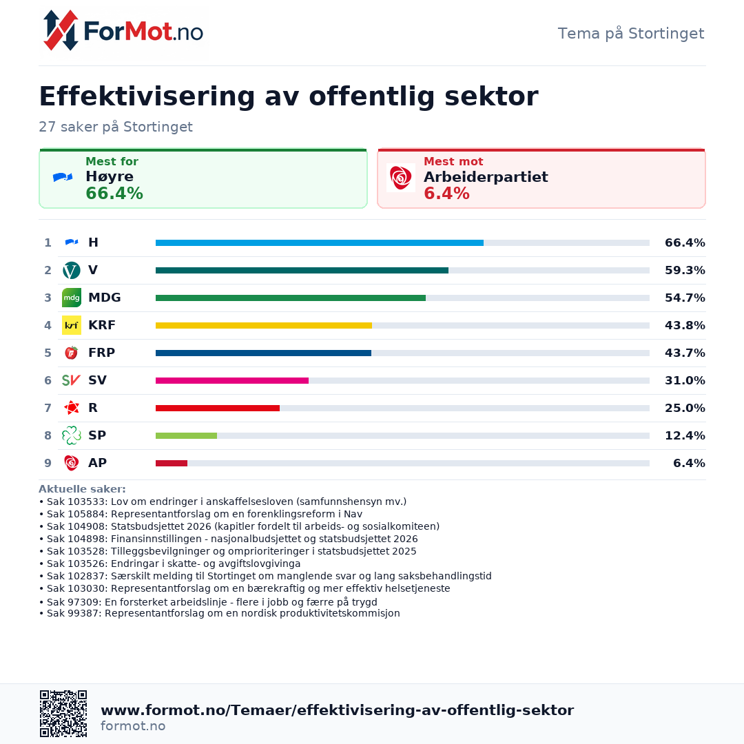 Her ser du hvordan partiene stemmer i saker om Effektivisering av offentlig sektor, med rangering, periodevalg og de mest sentrale sakene.
