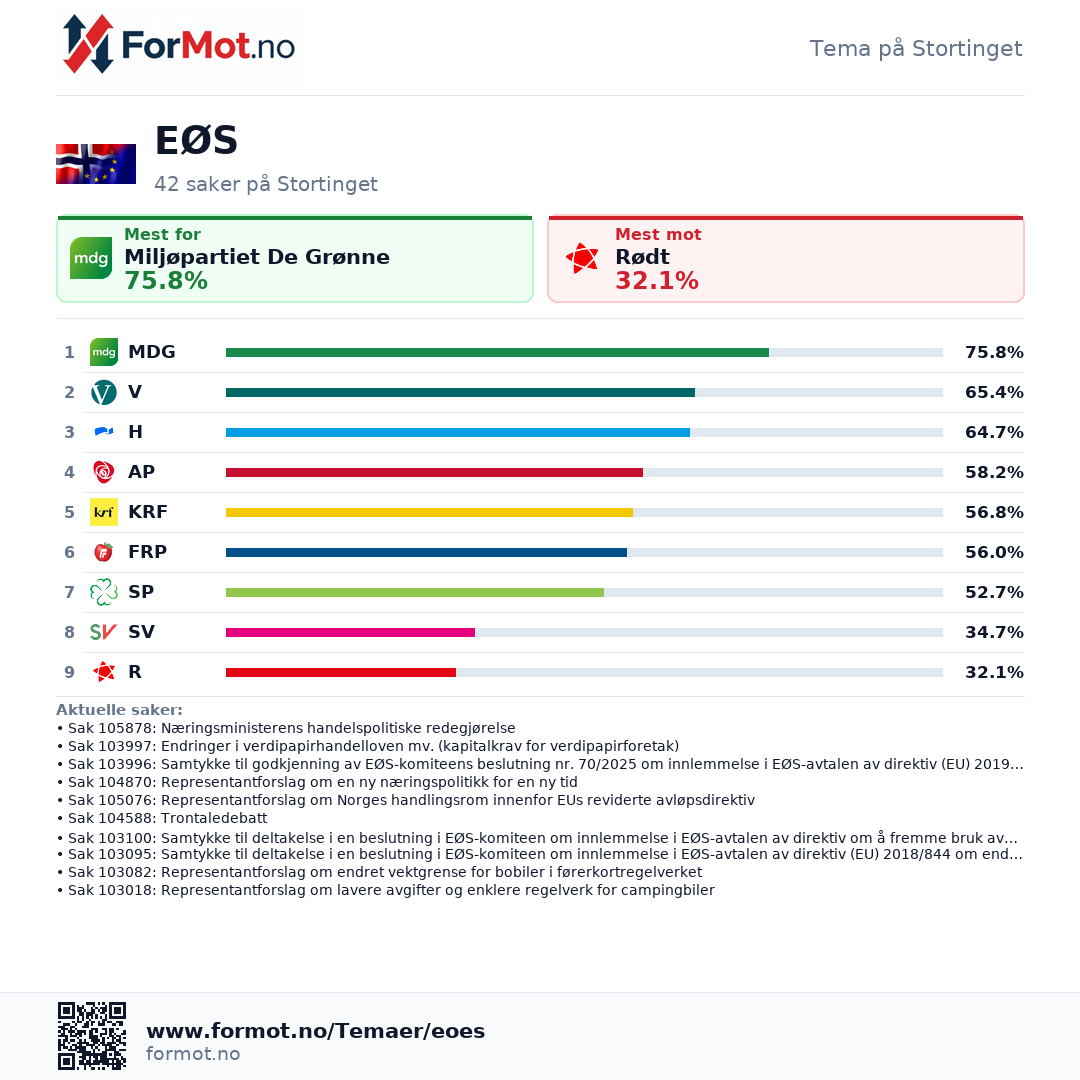 Her ser du hvordan partiene stemmer i saker om EØS, med rangering, periodevalg og de mest sentrale sakene.