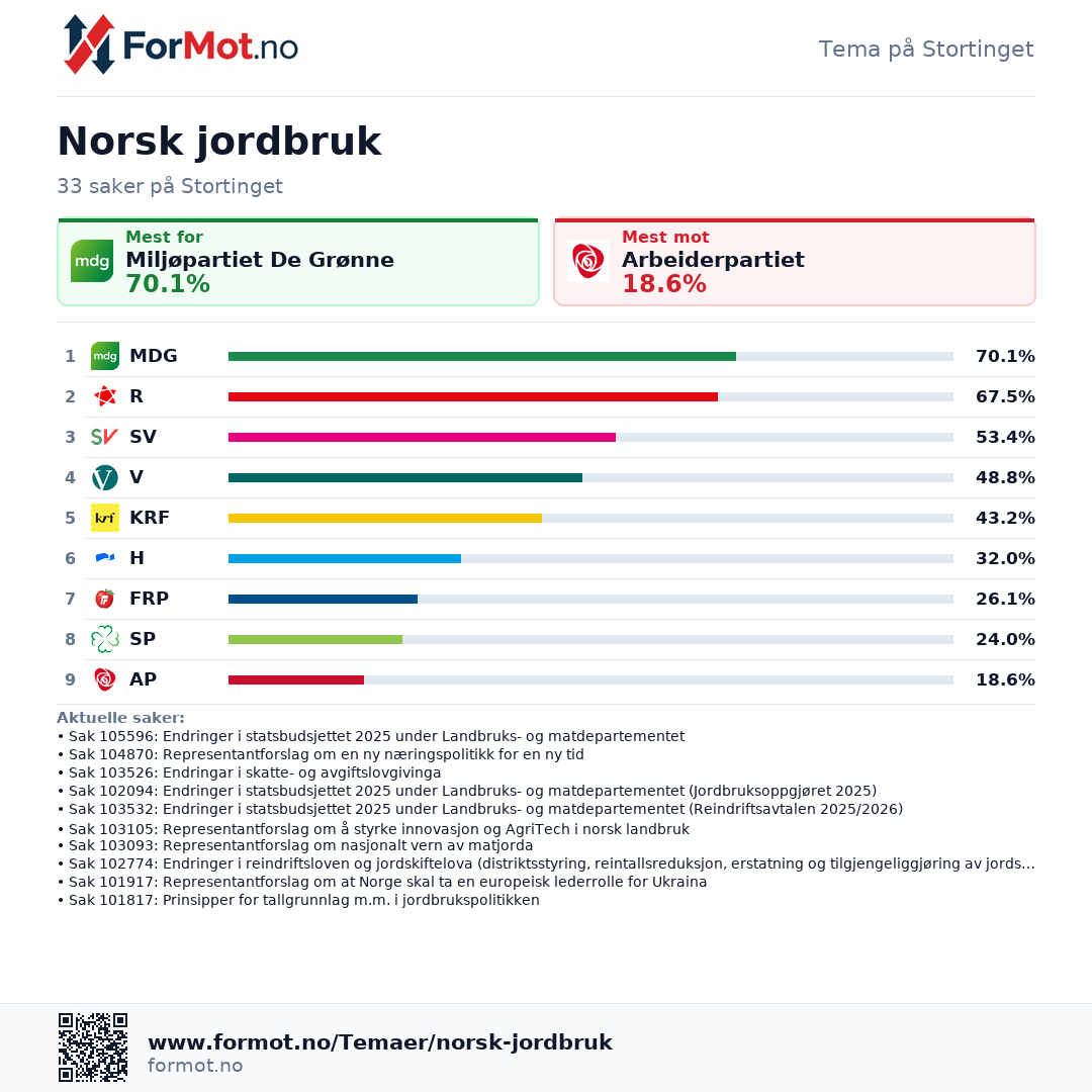Her ser du hvordan partiene stemmer i saker om Norsk jordbruk, med rangering, periodevalg og de mest sentrale sakene.