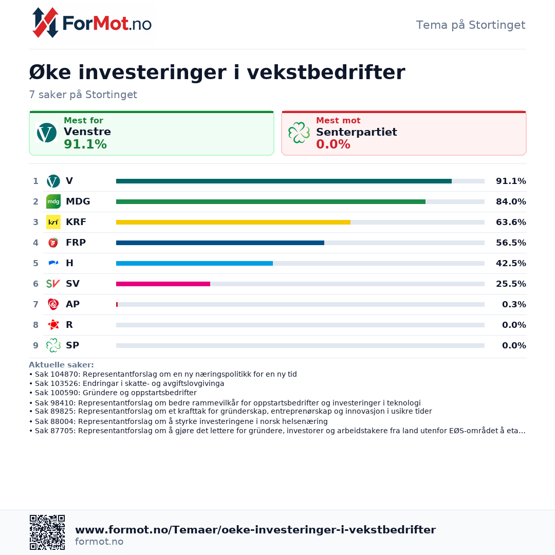 Her ser du hvordan partiene stemmer i saker om Øke investeringer i vekstbedrifter, med rangering, periodevalg og de mest sentrale sakene.