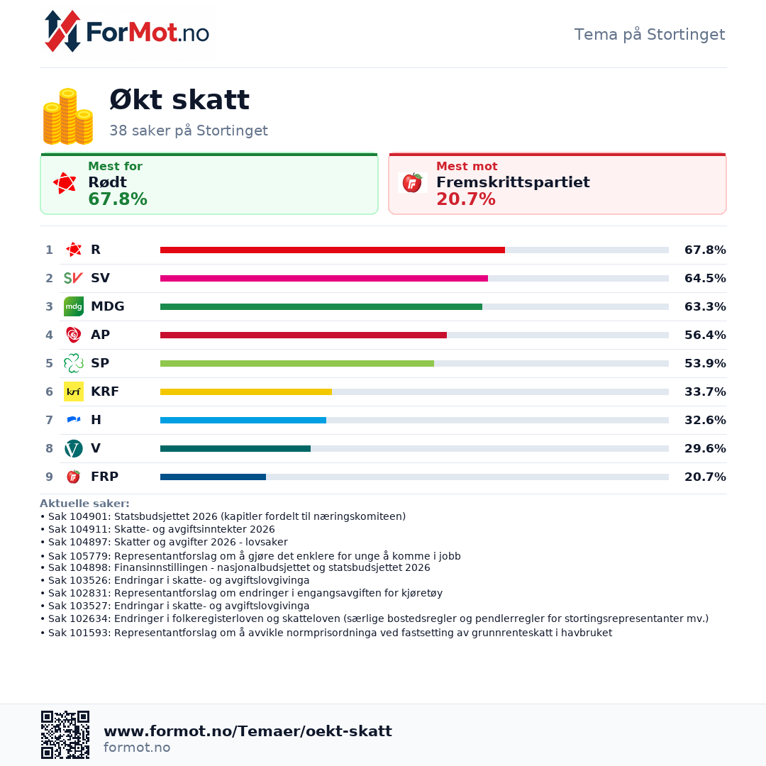 Her ser du hvordan partiene stemmer i saker om Økt skatt, med rangering, periodevalg og de mest sentrale sakene.