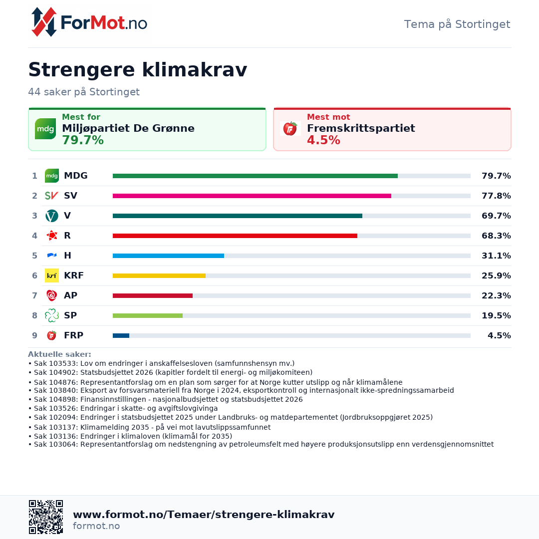 Her ser du hvordan partiene stemmer i saker om Strengere klimakrav, med rangering, periodevalg og de mest sentrale sakene.