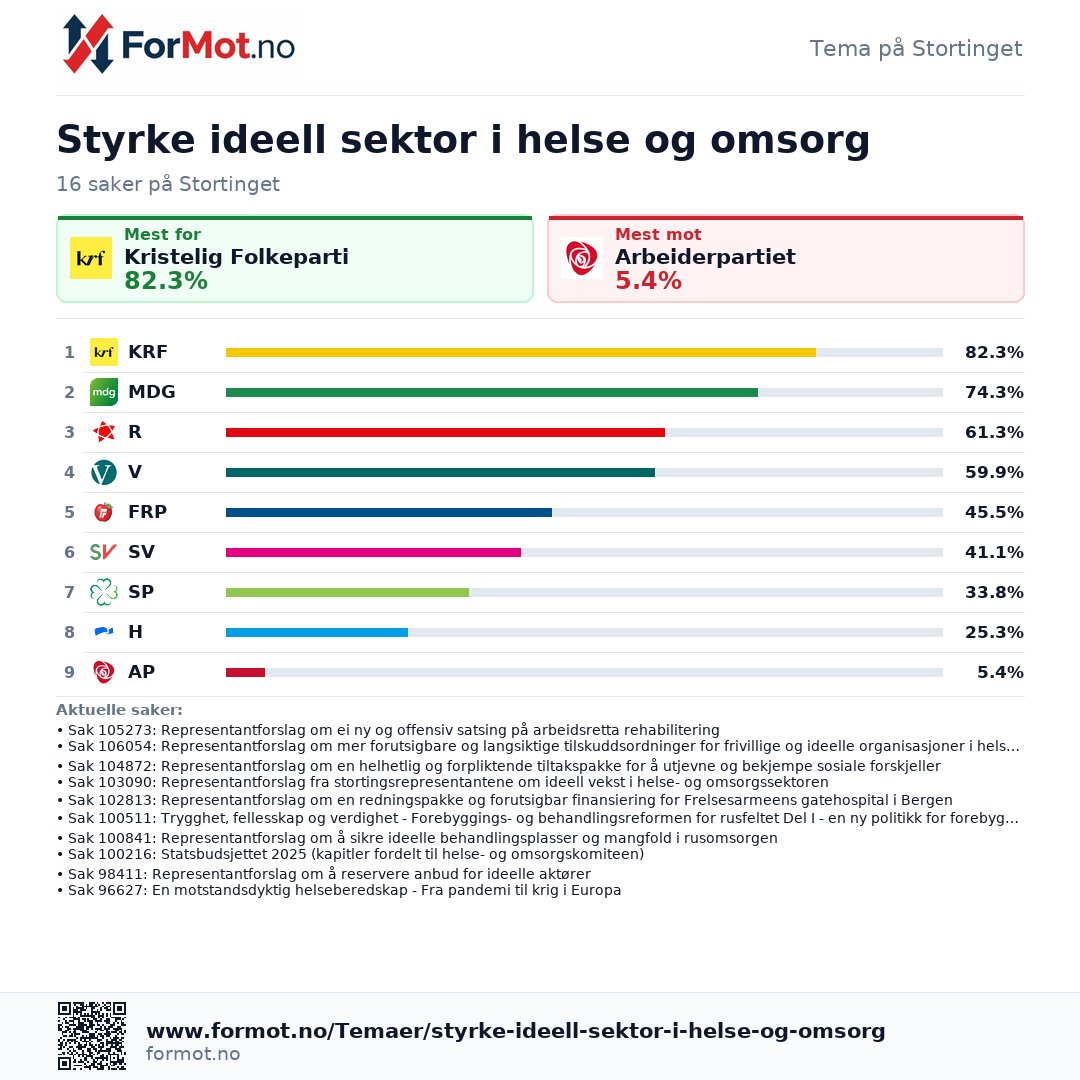 Her ser du hvordan partiene stemmer i saker om Styrke ideell sektor i helse og omsorg, med rangering, periodevalg og de mest sentrale sakene.